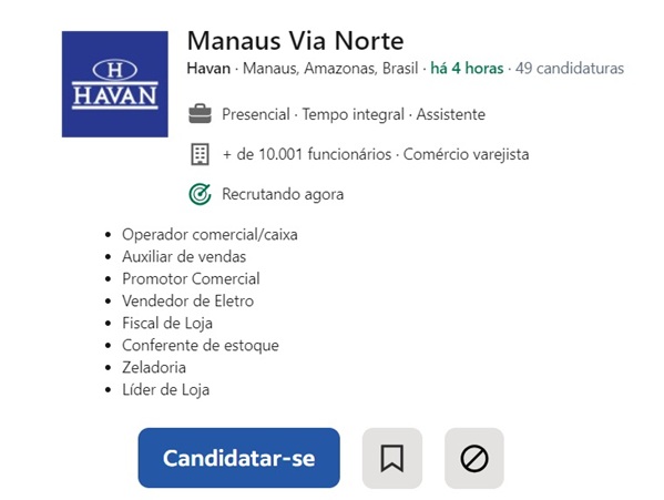 Vagas de EmpregosHAVAN Está Contratando para a Loja no Shopping Via Norte André Lucas | outubro 13, 2025