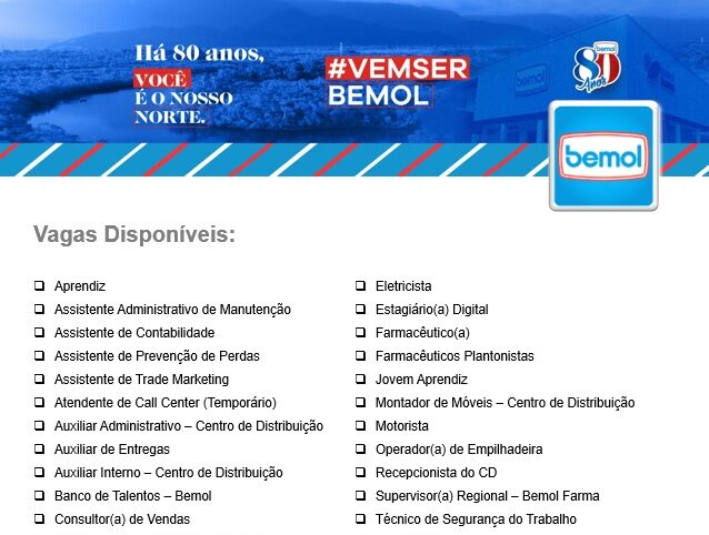 Carreira, Vagas de EmpregosVagas de NÃvel Médio e Superior para Trabalhar na Bemol André Lucas | dezembro 1, 2025